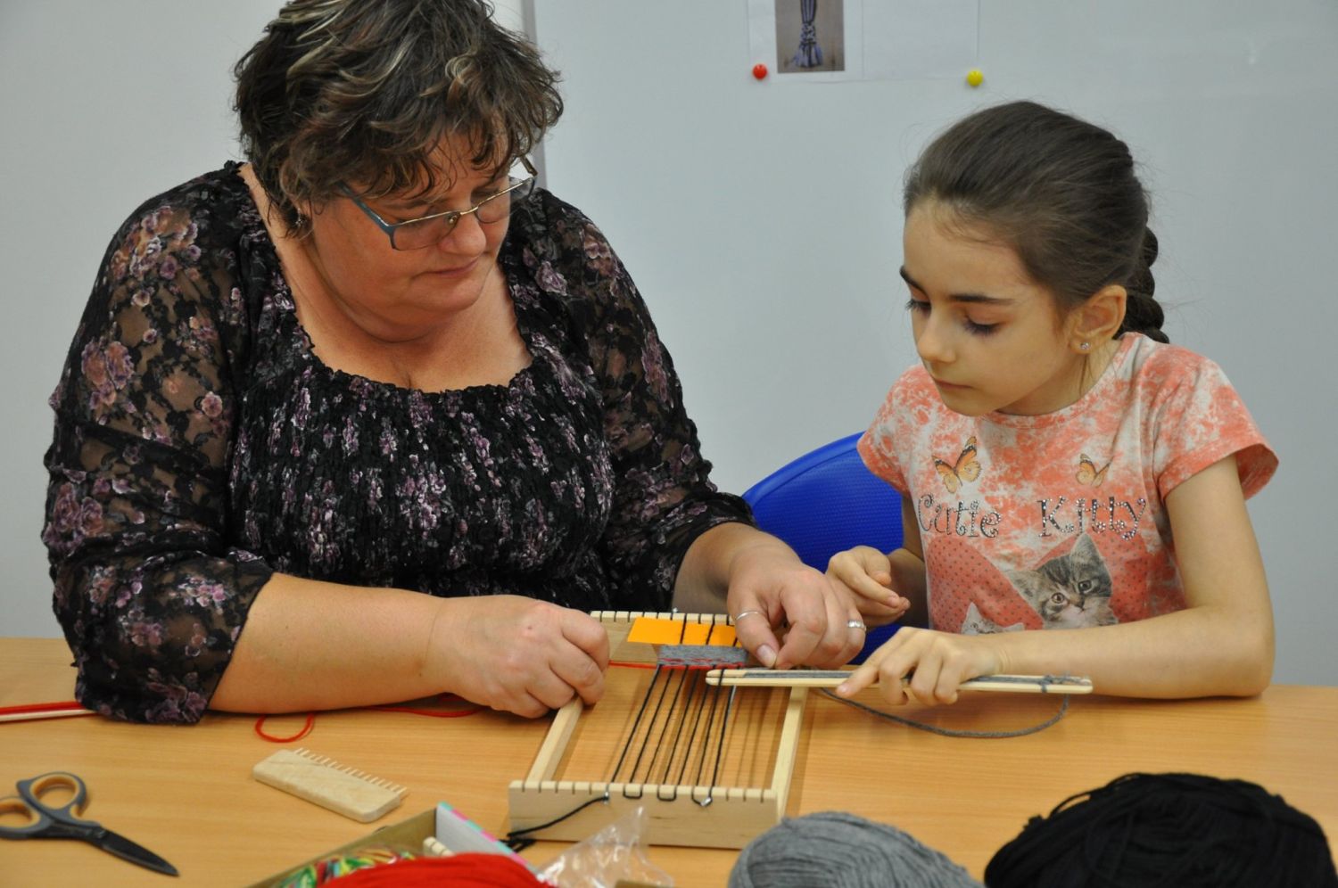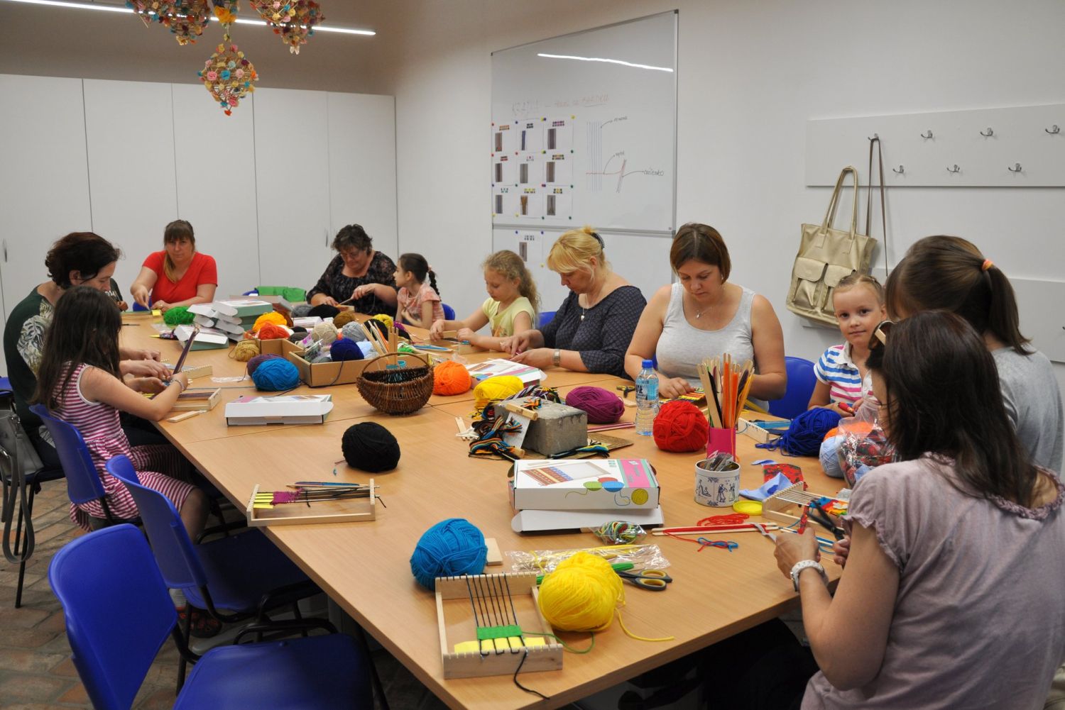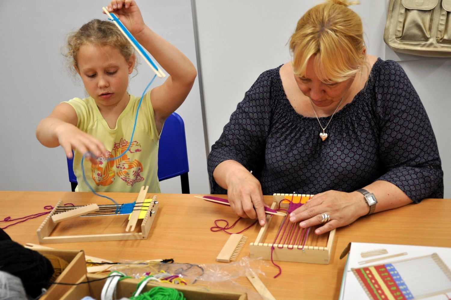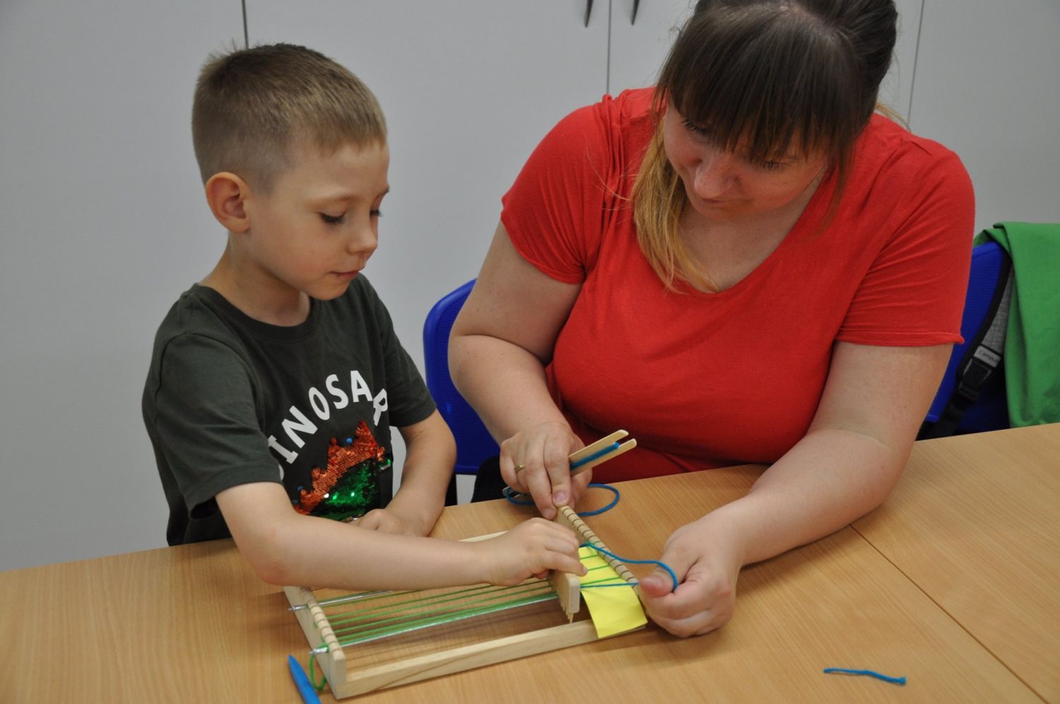 Po raz pierwszy odbyły się także rodzinne warsztaty tkackie, mające na celu wspólne spędzenie czasu rodzica z dzieckiem. Najmłodsi uczyli się zasad wiązania osnowy, przygotowania wątku tkackiego i posługiwania się czółenkiem. Pod czujnym okiem rodziców i pani Beaty Jankowskiej prowadzącej zajęcia, dzieci samodzielnie tkały własną tkaninę z wybranych przez siebie kolorów wełny. Były zachwycone faktem, że własnoręcznie utkana przez nie tkanina może stać się zarówno zakładką do książki, jak i wyjątkowym wisiorkiem – talizmanem. Warsztaty tkackie zostały wzbogacone opowieściami pani Beaty o dawnych zwyczajach związanych z tkaniem krajek.