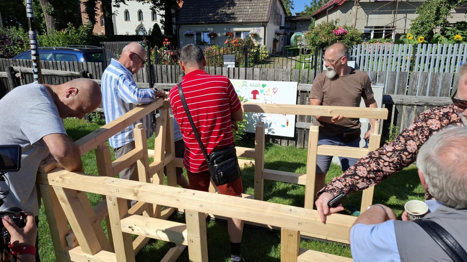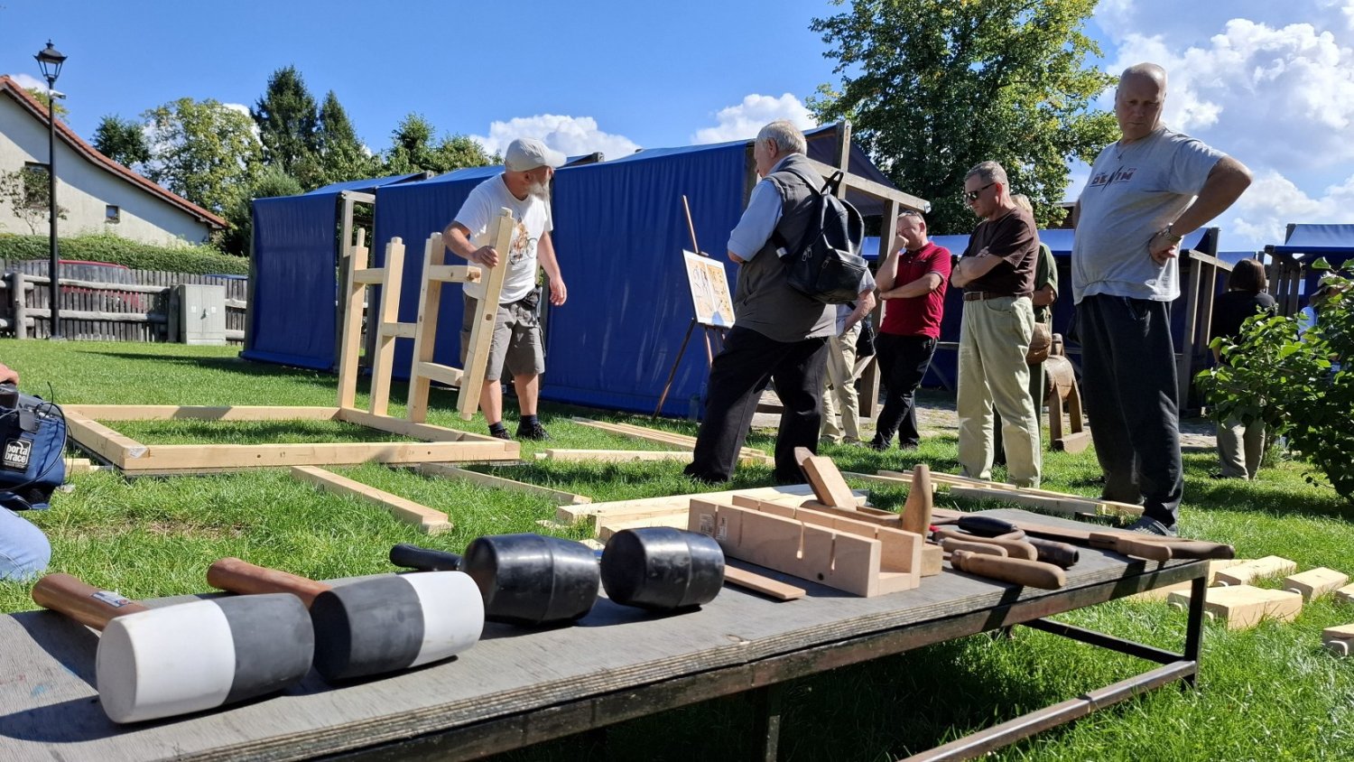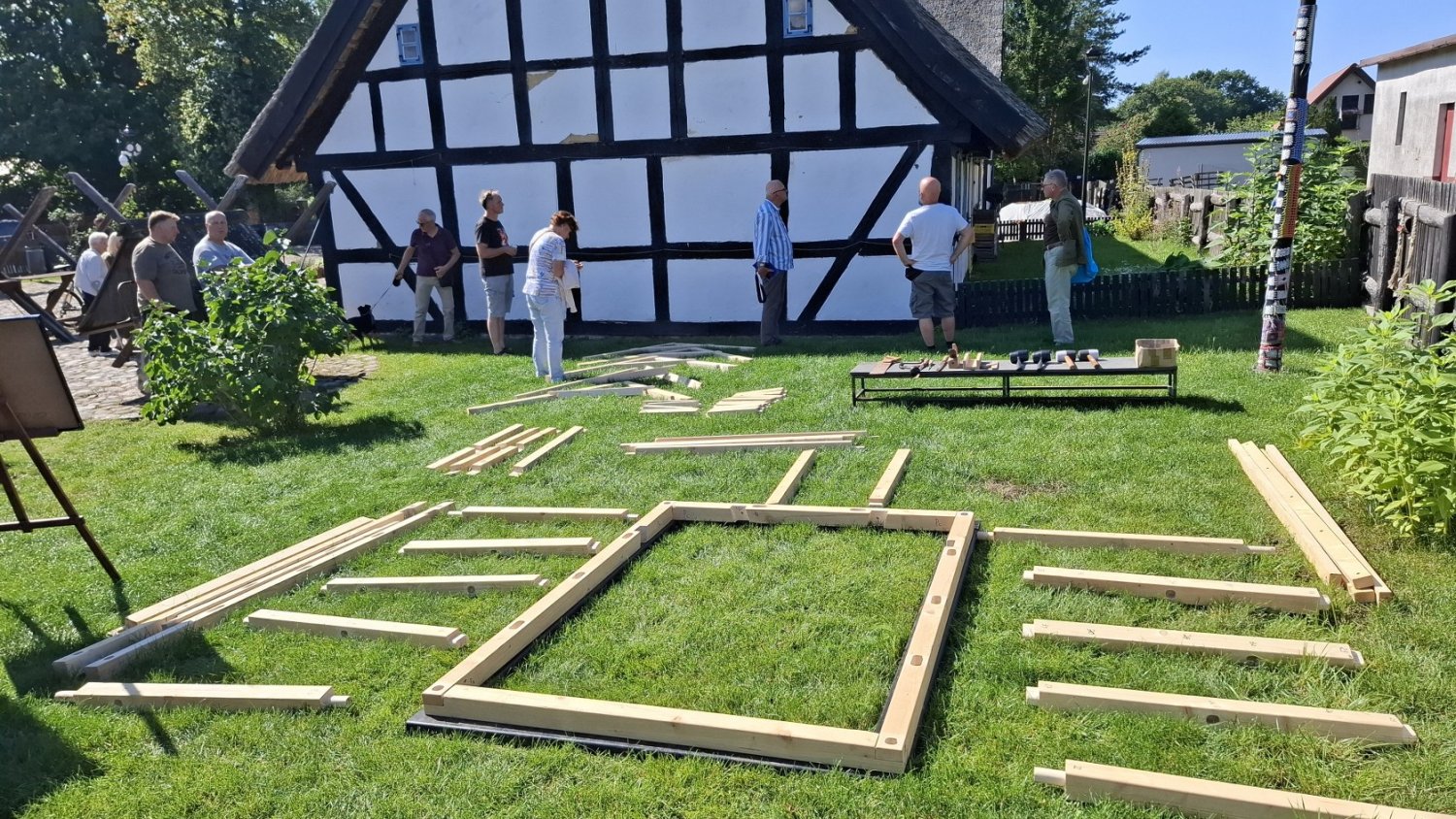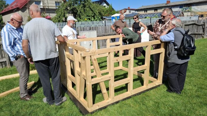 W drugiej części spotkania uczestnicy przenieśli się na teren zielony przy chałupie kmiecej, gdzie dr Andrzej Stachowiak, kustosz dyplomowany Muzeum w Koszalinie, na przykładzie tego obiektu przybliżył zasady budowania tego typu domów, po czym zaprosił do wspólnego budowania modelu szkieletu domu szachulcowego w skali 1:3. Choć początkowo udział uczestników ograniczał się do przyglądania się pracom i zadawania pytań, to wraz z postępami budowy zaczęli się także aktywnie przyłączać do składania kolejnych elementów modelu.